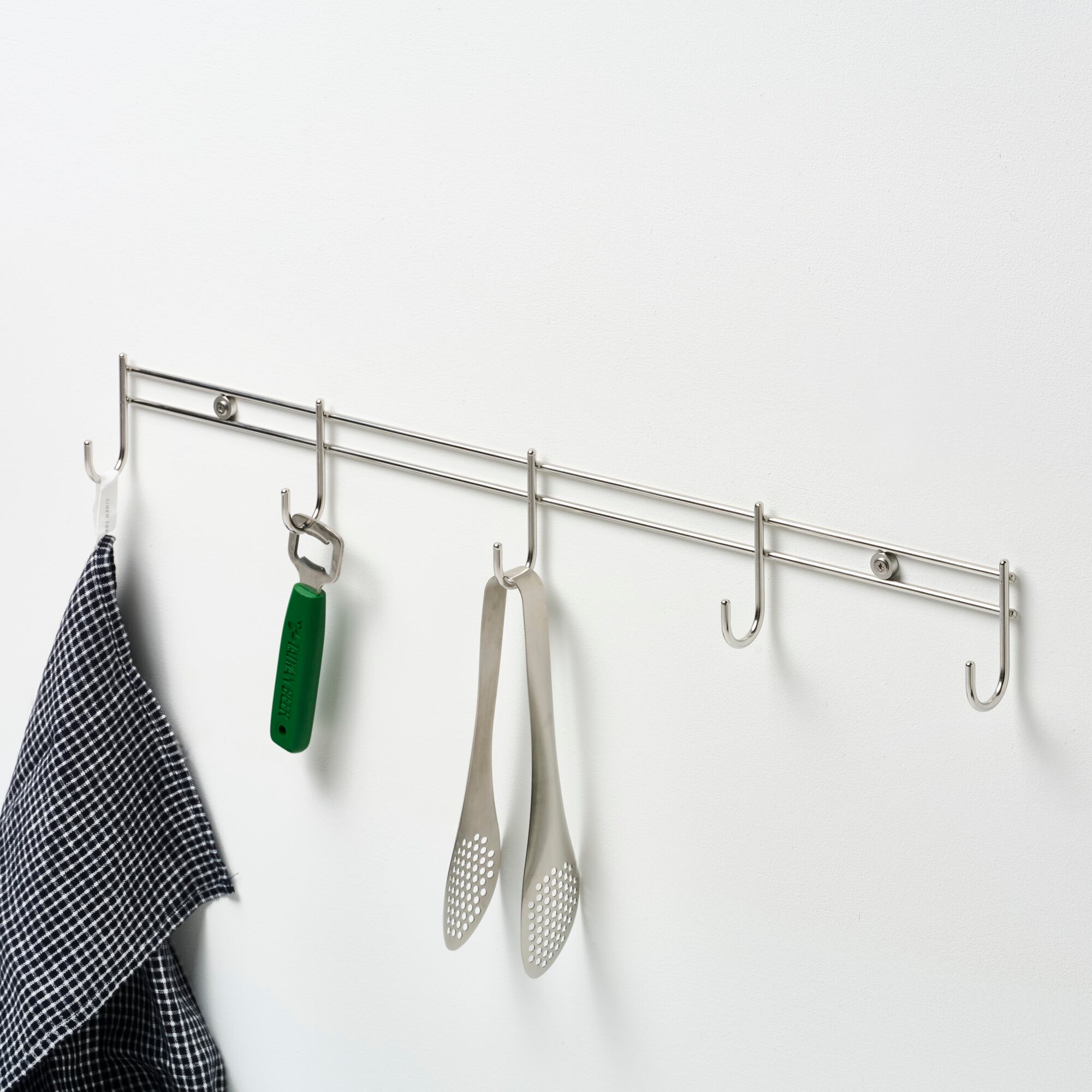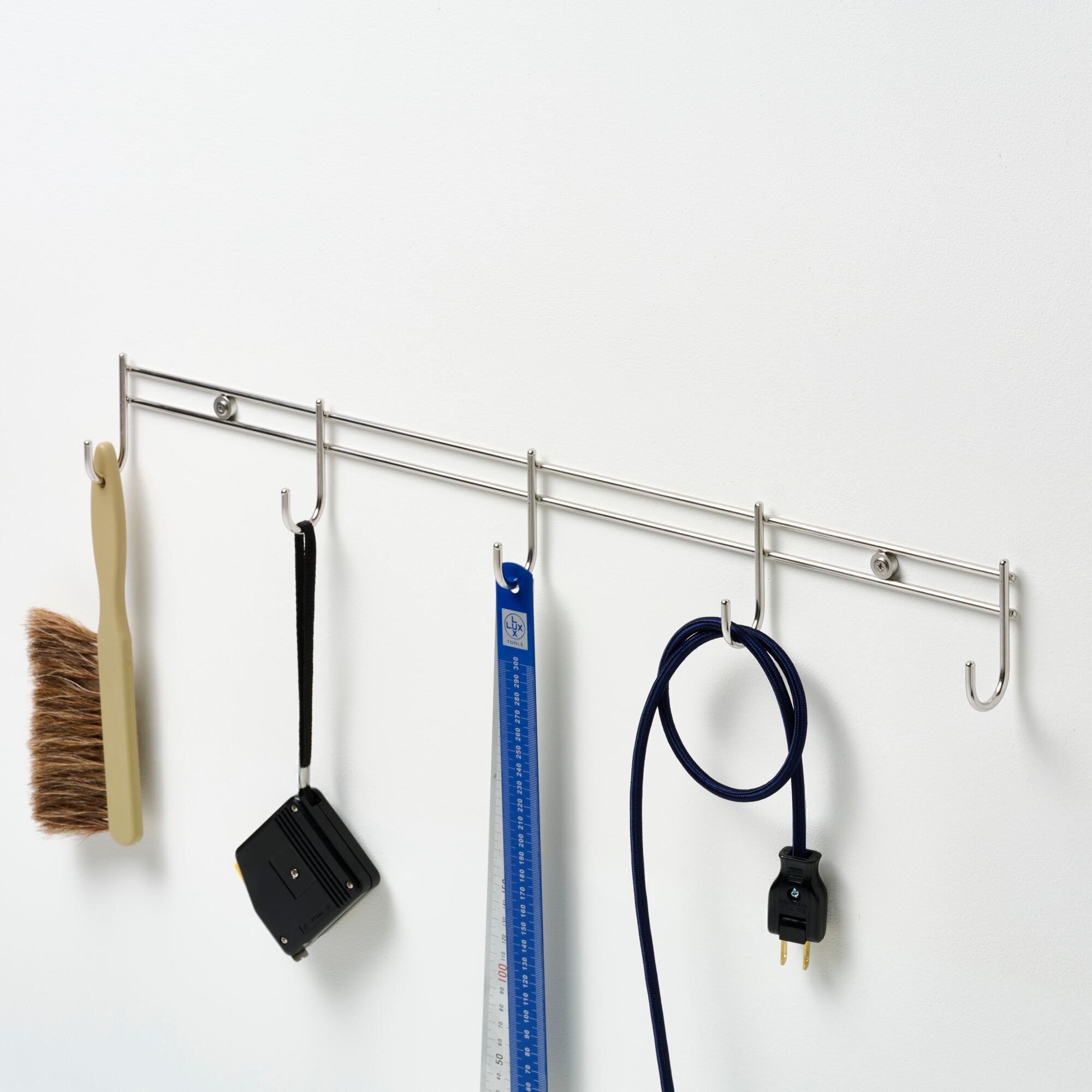 店舗什器用のフックから着想を得た、5連タイプのウォールフックです。フックパーツを支える2本の線材の間に、壁面固定用のワッシャーを挟み込んで溶接した、シンプルで無駄のない構成が特長。線材ならではの軽やかな印象と、実用に十分な強度を兼ね備えています。取り付けビスを含めステンレス製のため、水回りでもご使用いただけます。