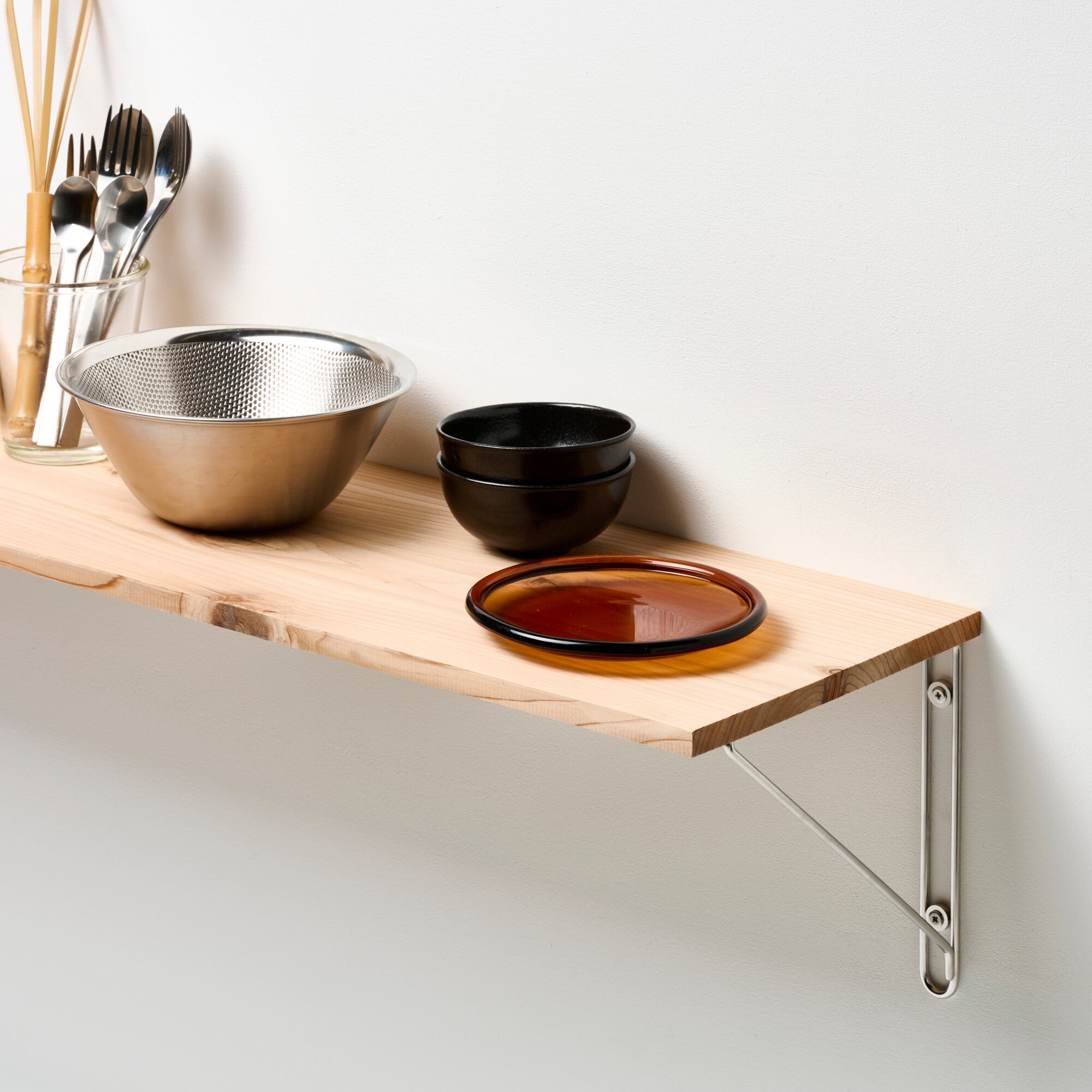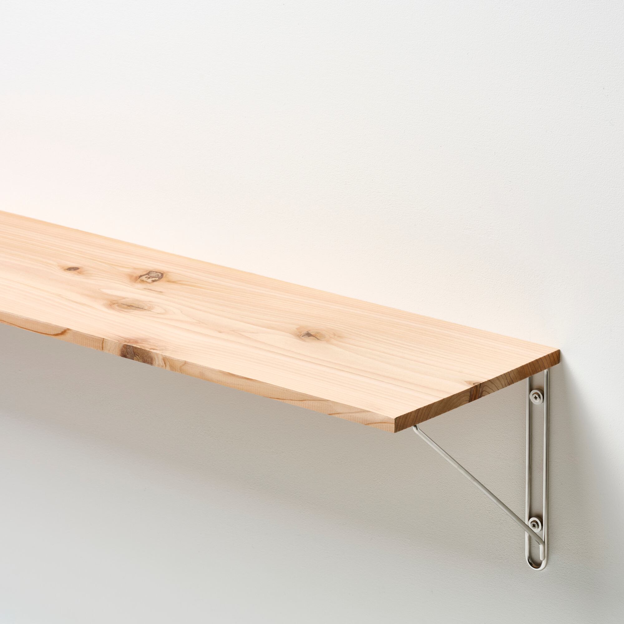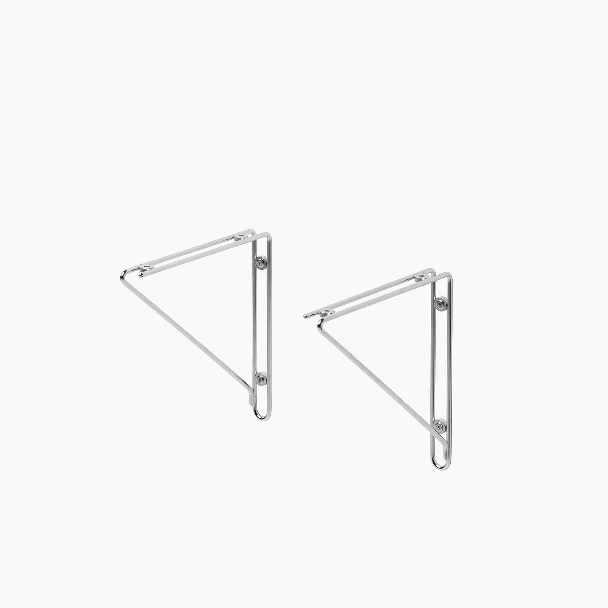 線材を一筆書きのように曲げ、線材の間に固定用のワッシャーを溶接することで強度を高めたブラケットです。左用と右用が各1点で1セットとなっています。棚板の奥行きは250mmまでに対応、棚板の厚みは15mm以上のものをご使用ください。取り付けビスを含めステンレス製のため、水回りでもご使用いただけます。