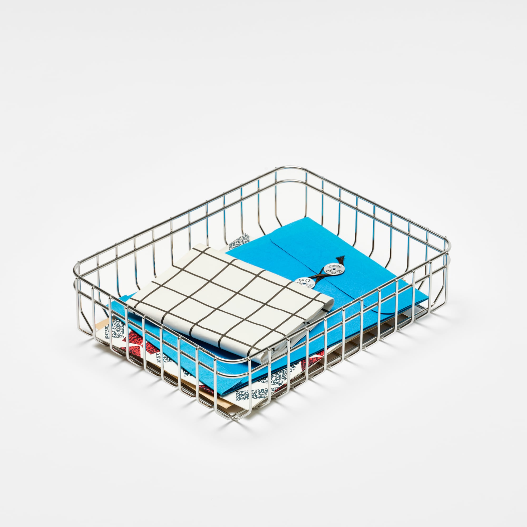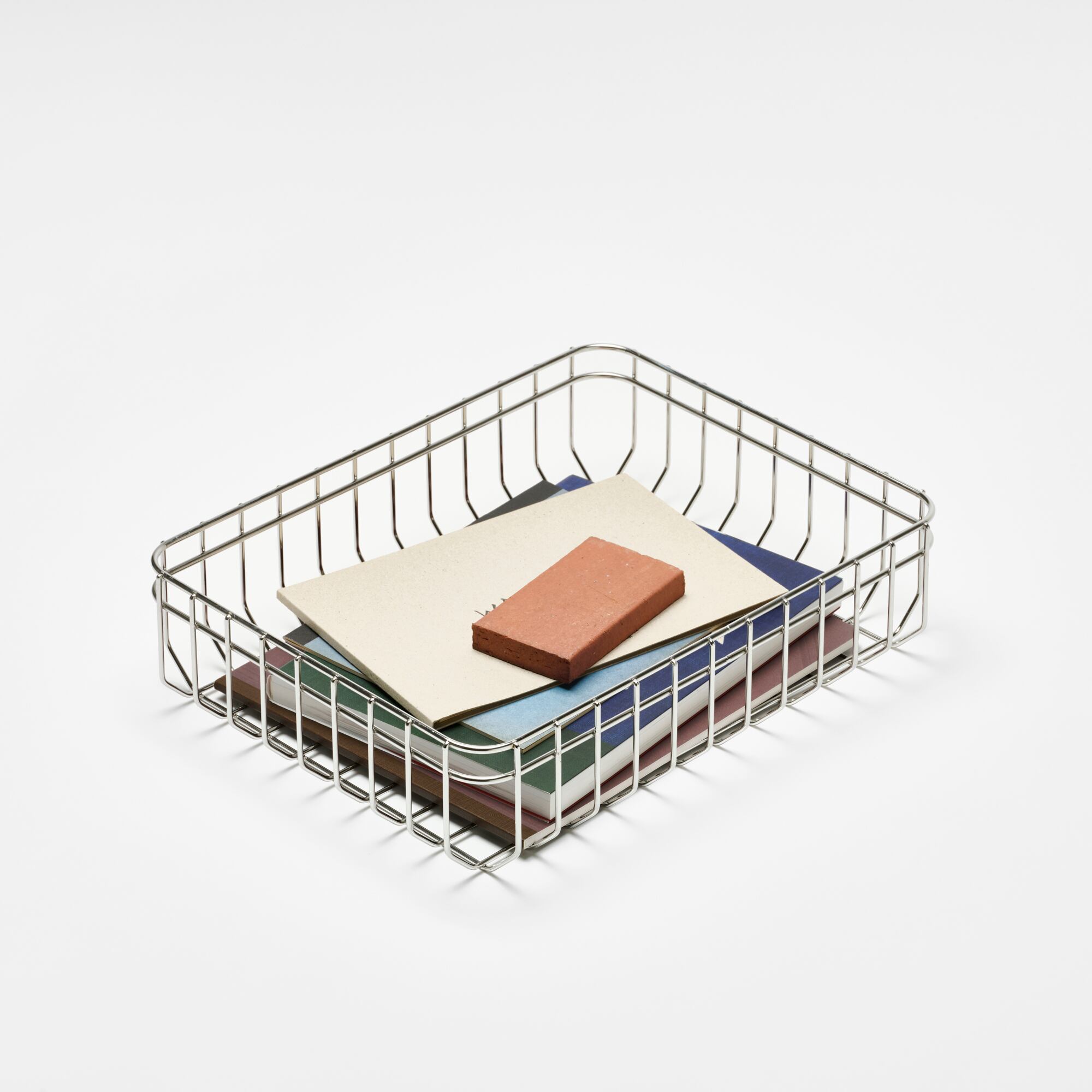 通常よりやや太い線材を使用して強度を高め、垂直方向のラインのみで構成したバスケットです。底面の角を斜めに曲げることでスタッキングを可能にしています。浅型の「Basket 87」を2つ重ねると、深型の「Basket 160」1つと同じ高さになります。ステンレス製のため、水回りでもご使用いただけます。
